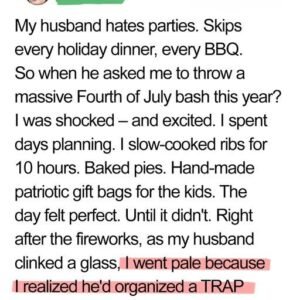 After years of avoiding every family gathering, my husband Eric shocked me by suggesting we host a big Fourth of July party. I was thrilled, thinking he’d…