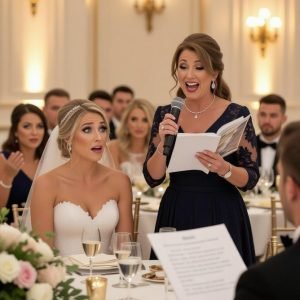 I only invited my cru/el stepmother, Meredith, to my wedding because my father begged me. For years, he never defended me from her insults. At the reception, she strutted to the microphone with a smug grin, pulling out something I thought was gone forever—my childhood pink diary, its flimsy silver lock still intact. She began to read, but her confidence faltered when my father suddenly rose, his voice sharp and commanding, stunning everyone into silence.