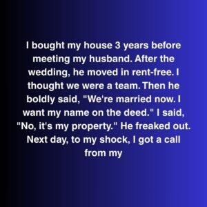 I bought my house 3 years before meeting my husband. After the wedding, he moved in rent-free. I thought we were a team. Then he boldly said,…