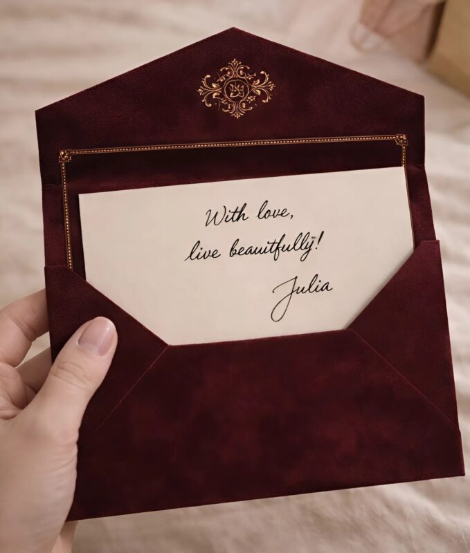 I took the burgundy envelope to the restaurant—the same one. Inside was her own card. And a few lines from me: