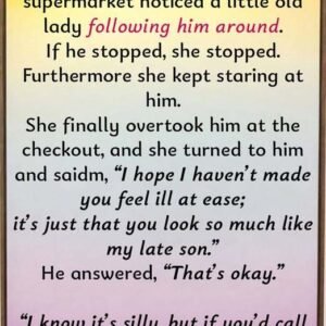 A young man shopping in a supermarket noticed a little old lady following him around. If he stopped, she stopped. Furthermore she kept staring at him. She…