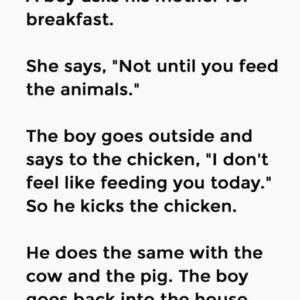 A boy asks his mother for breakfast. She says, “Not until you feed the animals.” The boy goes outside and says to the chicken, “I don’t feel…