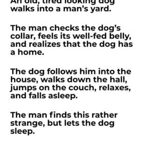 An old, tired looking dog walks into a man’s yard. The man checks the dog’s collar, feels its well-fed belly, and realizes that the dog has a…