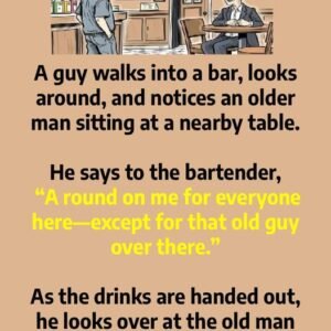 A guy walks into a bar, looks around, and notices an older man sitting at a nearby table. He says to the bartender, “A round on me…