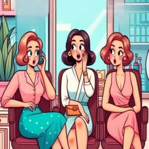 Three women are sitting in a beauty parlor, chatting about their husbands.