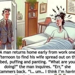 A man returns home early from work one afternoon to find his wife spread out on the bed, puffing and panting, her face red and sweaty.b Startled,…