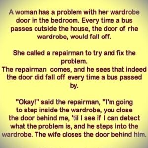 A woman kept having a strange problem with her bedroom wardrobe. Every time a bus passed outside, the wardrobe door would fall off. Tired of dealing with…