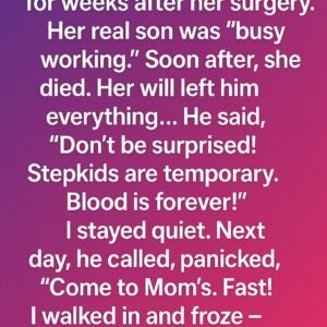I cared for my stepmom for weeks after her surgery. Her real son was “busy working.” Soon after, she died. Her will left him everything… He said,…