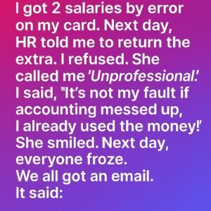 I got 2 salaries by error on my card. Next day, HR told me to return the extra. I refused. She called me “unprofessional.” I said, “It’s…