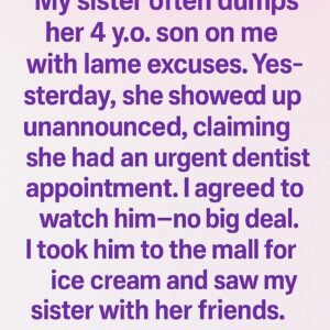 My sister often dumps her 4 y.o. son on me with lame excuses. Yesterday, she showed up unannounced, claiming she had an urgent dentist appointment. I agreed…