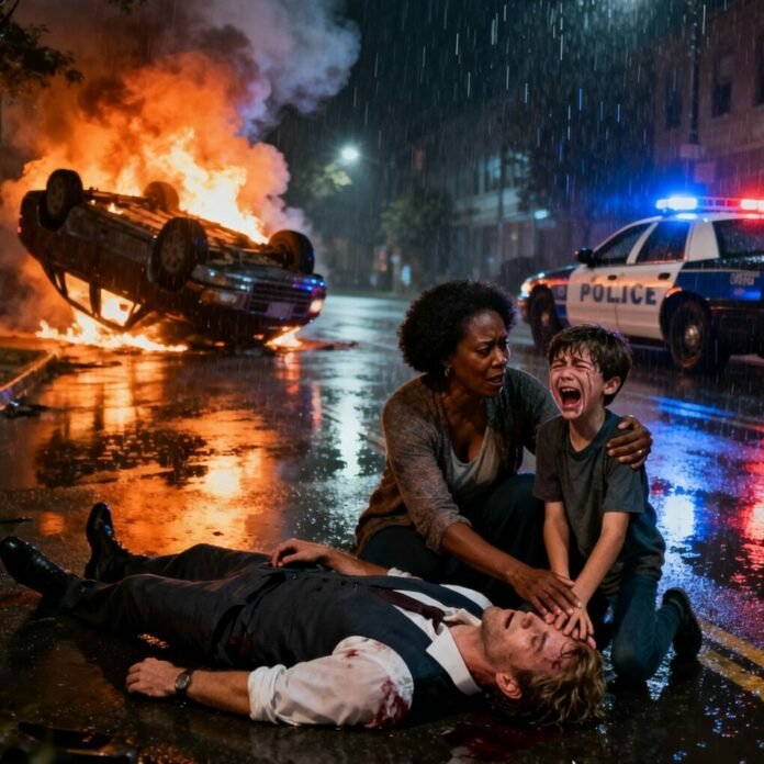 A homeless Black woman saved a millionaire and his child from an accident in the pouring rain — but one sentence he said before fainting shocked her so much that she immediately called the police…