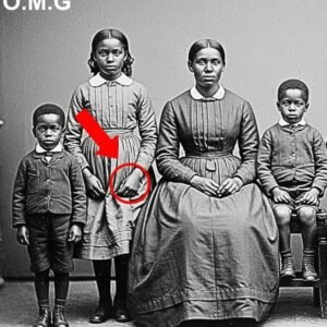 The first thing you notice is her hand. Not the stiff dresses, not the solemn faces, not the faded studio backdrop. Her hand. It shouldn’t be there,…