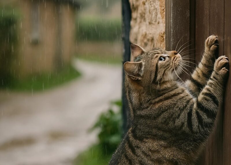 The cat let out a pitiful meow and, trembling, approached the nearest door. She rose up on her hind legs and scratched desperately at the wooden surface. She meowed loudly and insistently, hoping someone would hear.