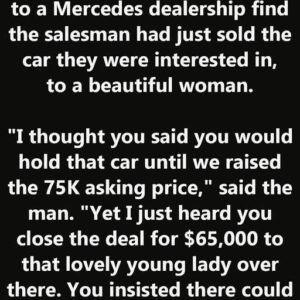 An elderly couple returned to a Mercedes dealership find the salesman had just sold the car they were interested in to a beautiful woman. “I thought you…