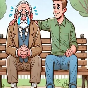 A 90-year-old man is sitting on a park bench, sobbing