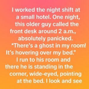 I worked the night shift at a small hotel. One night, this older guy called the front desk around 2 a.m., absolutely panicked. “There’s a ghost in…