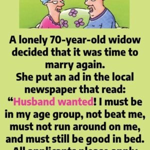 A lonely 70-year-old widow decided that it was time to marry again. She put an ad in the local newspaper that read: “Husband wanted! I must be…