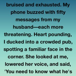 Leaving work late, I was bruised and exhausted. My phone buzzed with fifty messages from my husband—each more threatening. Heart pounding, I ducked into a crowded pub,…