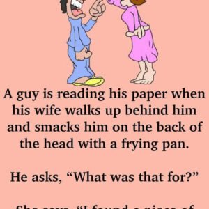 A guy is reading his paper when his wife walks up behind him and smacks him on the back of the head with a frying pan. He…