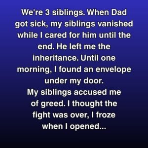 We’re 3 siblings. When Dad got sick, my siblings vanished while I cared for him until the end. He left me the inheritance. Until one morning, I…