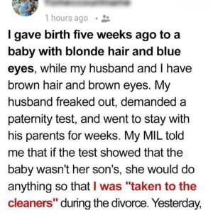 I gave birth five weeks ago to a beautiful baby girl with blonde hair and bright blue eyes—traits that neither my husband nor I have, since we…