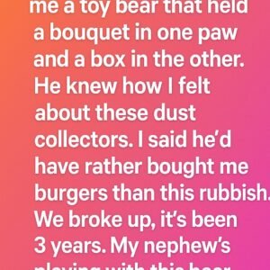 My ex-boyfriend gave me a toy bear that held a bouquet in one paw and a box in the other. He knew how I felt about these…