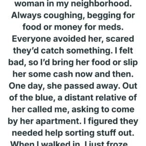 There used to be this elderly woman in my neighborhood. Always coughing, begging for food or money for meds. Everyone avoided her, scared they’d catch something. I felt bad, so…