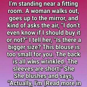 I’m standing near a fitting room. A woman walks out, goes up to the mirror, and kind of asks the air, “I don’t even know if I…